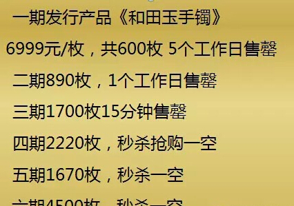 截至目前為止,和田碧玉手鐲已經(jīng)發(fā)售了6期,情況如下: