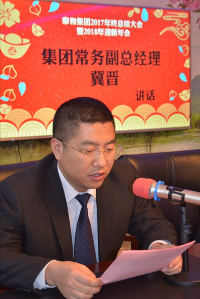 集團董事長張建忠致新春賀詞,他表示2017年是不平凡的一年,面對國家政策調控、銀行緊縮貸款等不利因素的影響下,在各位領導和大家的共同努力下,度過了這艱難的一年。2018年經濟形勢將更加嚴峻,我真心地希望大家能夠珍惜泰和集團給予我們的這個平臺,在這個平臺上使大家能夠充分體現(xiàn)出自我價值,去付出自己的真誠和努力,去成就已有的事業(yè)和學識。過去的一年公司在保證原有業(yè)務持續(xù)發(fā)展的同時,也在逐步嘗試開展新的業(yè)務。新的一年,我們要加強國際貿易和國內貿易,通過組建優(yōu)秀的貿易團隊,再結合自身的石油化工實體業(yè)務,與大型國企和上市公司進行合作,爭取取得更好的成績。