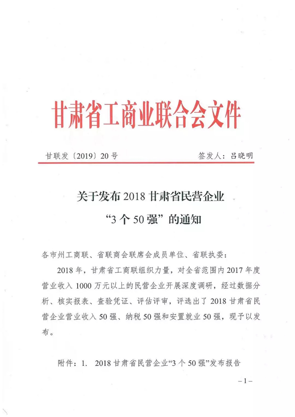 2018年甘肅省工商聯組織力量,對全省范圍內2017年度營業(yè)收入1000萬元以上的民營企業(yè)開展深度調研,經過數據分析、核實報表、查驗憑證、評估評審,評選出了2018甘肅省民營企業(yè)營業(yè)收入50強、納稅50強、安置就業(yè)50強。