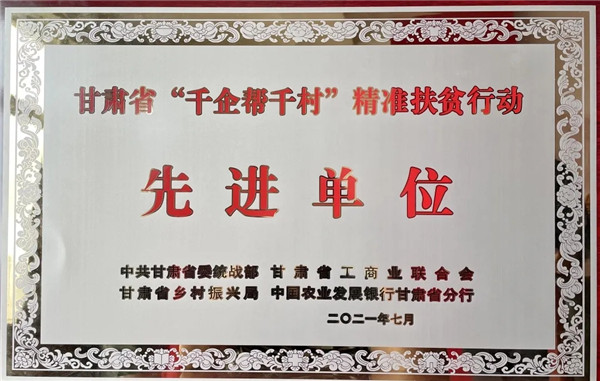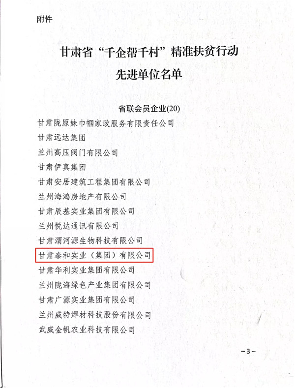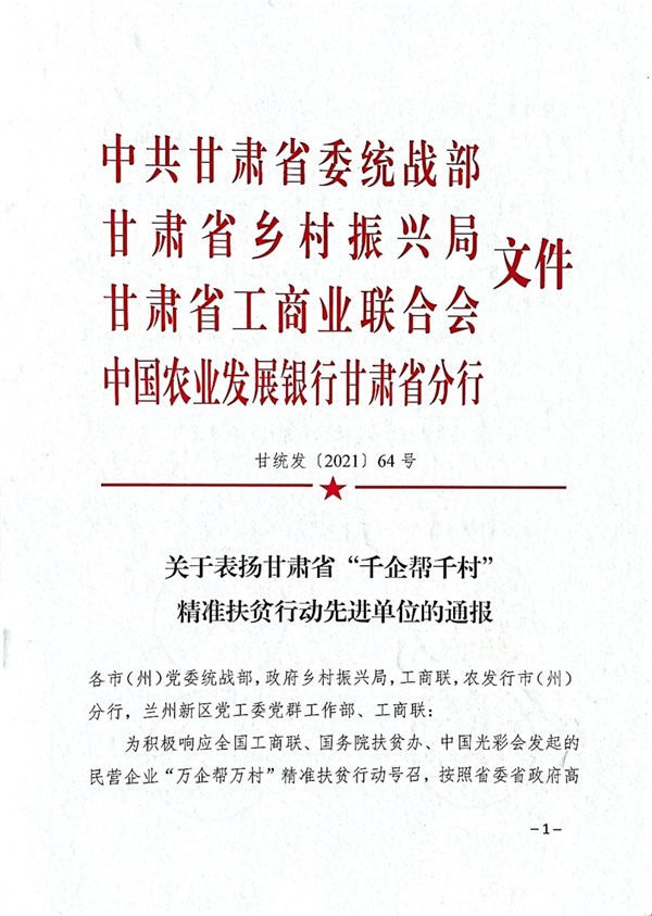 近日,甘肅省委統(tǒng)戰(zhàn)部、甘肅省工商聯(lián)、甘肅省鄉(xiāng)村振興局、農(nóng)發(fā)行甘肅分行發(fā)布《關(guān)于表?yè)P(yáng)甘肅省“千企幫千村”精準(zhǔn)扶貧行動(dòng)先進(jìn)單位的通報(bào)》,對(duì)參與我省“千企幫千村”精準(zhǔn)扶貧行動(dòng)表現(xiàn)突出的273家民營(yíng)企業(yè)和商會(huì)組織予以通報(bào)表彰,甘肅泰和實(shí)業(yè)(集團(tuán))有限公司榮獲甘肅省“千企幫千村”精準(zhǔn)扶貧行動(dòng)“先進(jìn)單位”稱號(hào)。