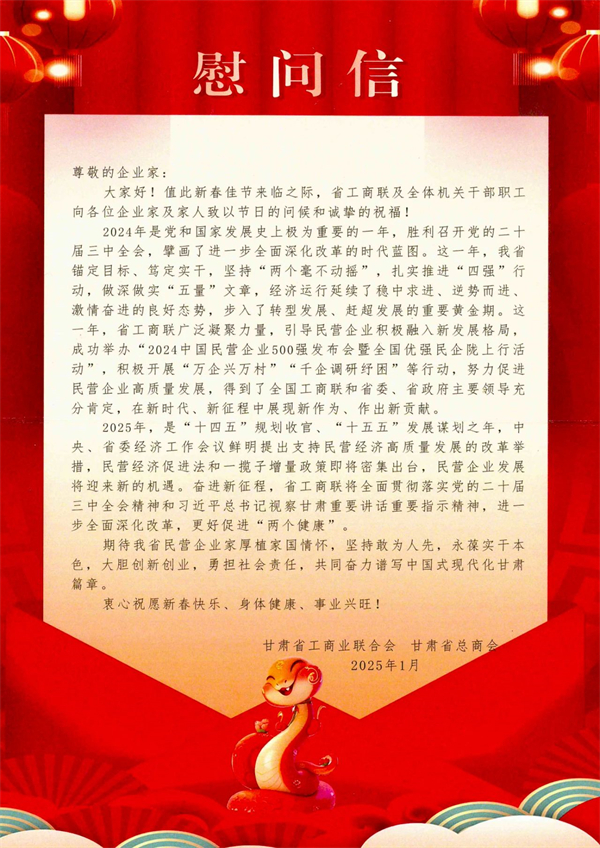 2025年新春佳節(jié)到來之際,甘肅省工商聯(lián)黨組成員、副主席朵雪青一行到訪我司,開展春節(jié)慰問活動。省工商聯(lián)商會工作部部長丁敏、干部梁莉陪同走訪。